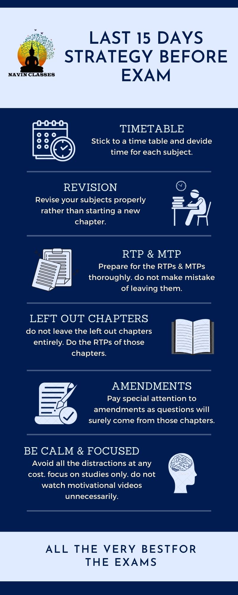 - Be Calm & Focused: prioritize your studies & be focused on it entirely. Avoid all the distractions at any cost. Stop using Social Media till Exams. It is important to follow a healthy routine. Go to bed on time and wake up early. Ensure a 7 to 8 hours of sleep to keep yourself active throughout the day.